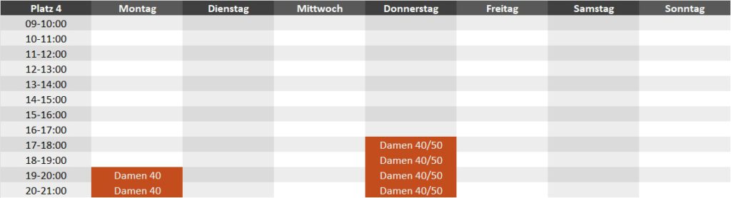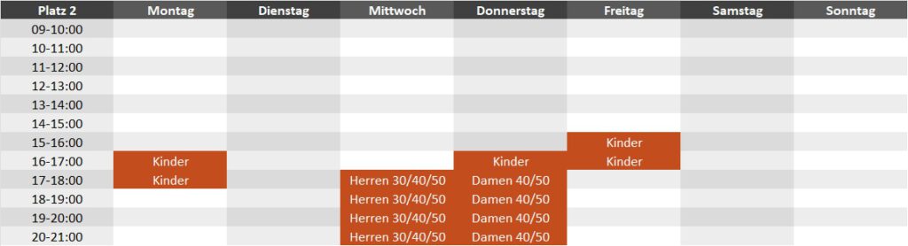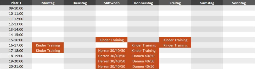 Die Plätze sind frei bespielbar – Termine braucht ihr nicht zu buchen. Zu den folgenden Zeiten sind die Plätze von unseren Teams für Trainings geblockt (Stand April 2026):